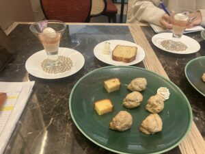(KITTEのティーサロンでパティシエの用意したものを試食する)